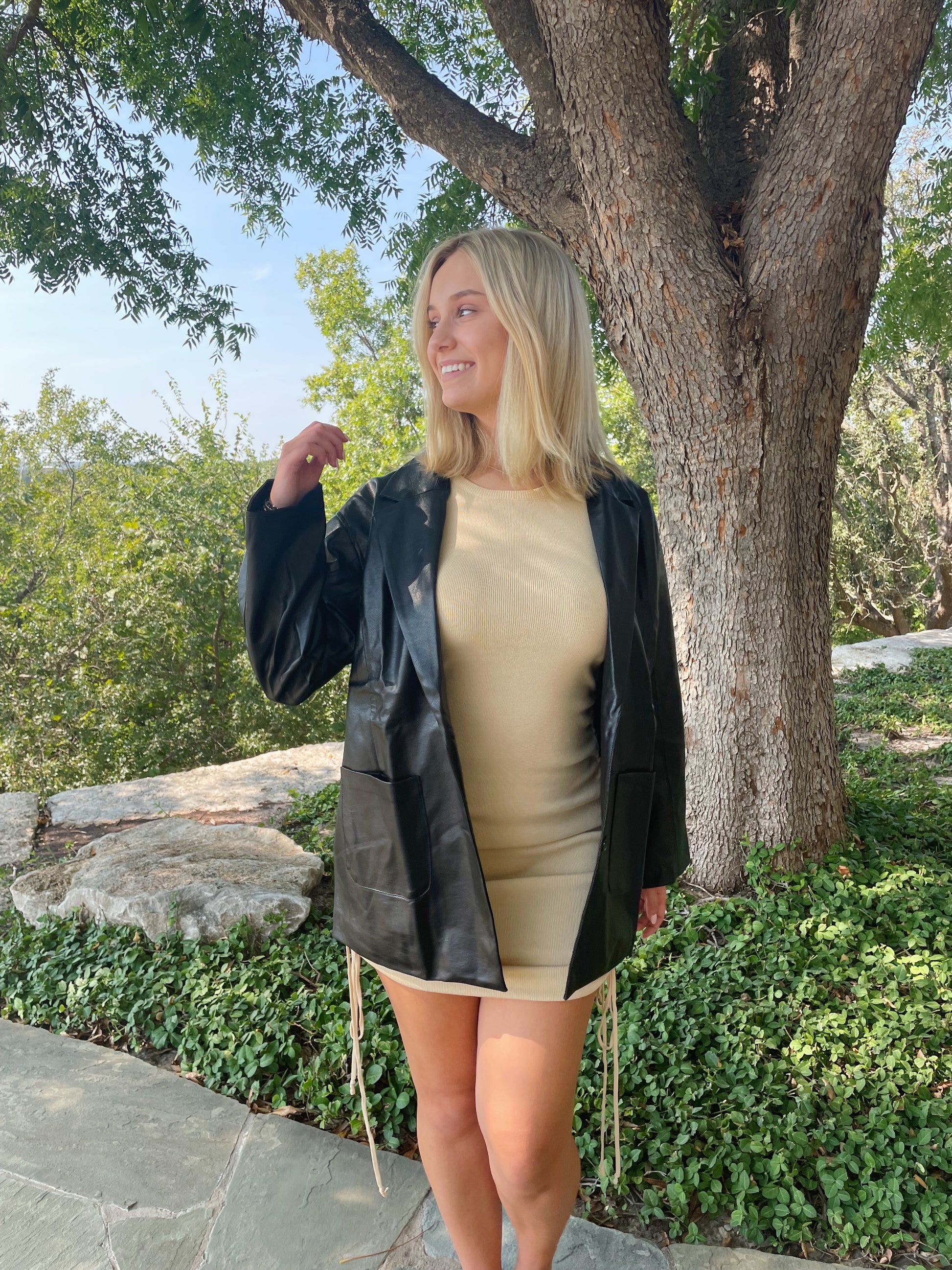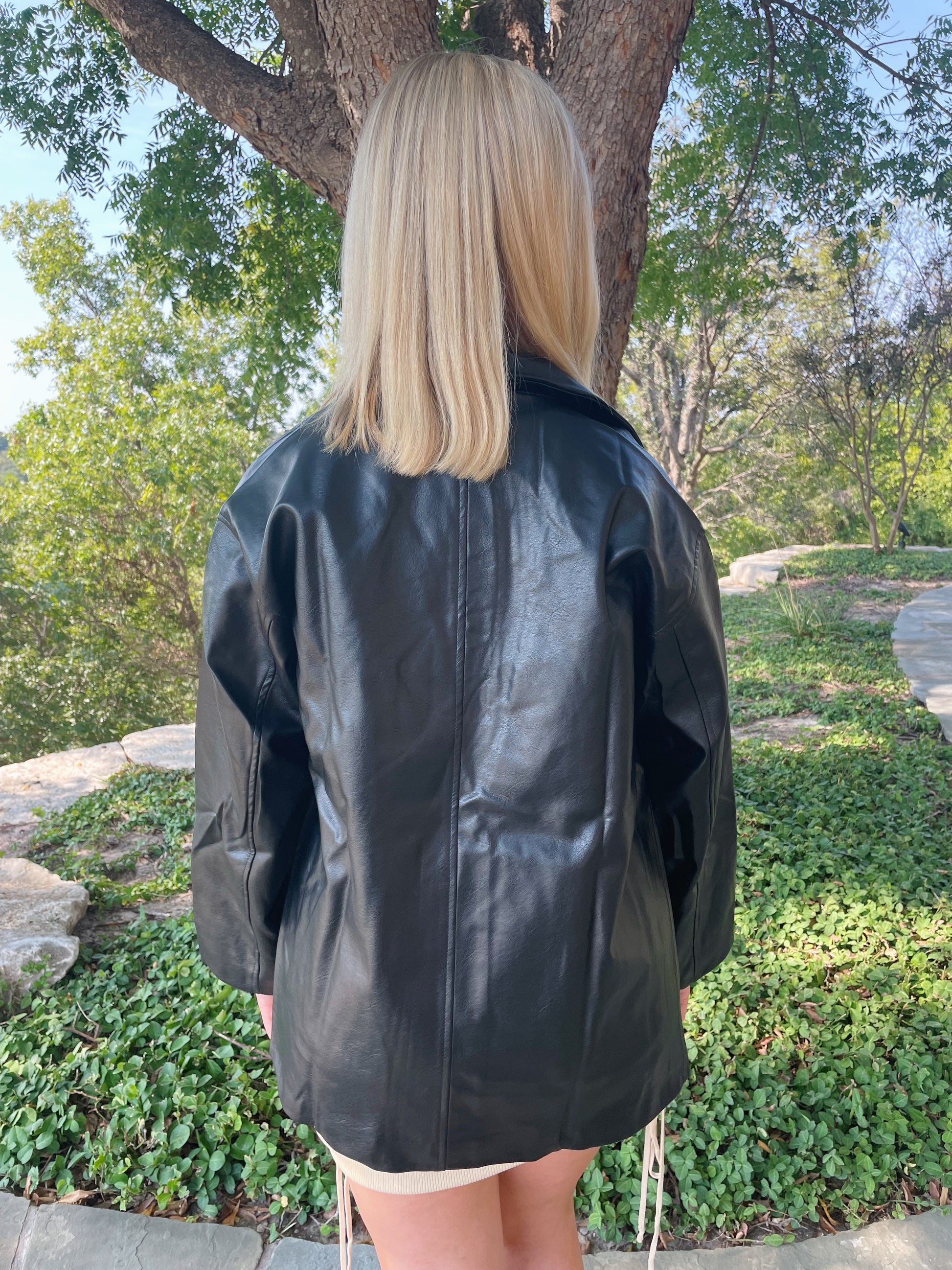 This black leather jacket is perfect for fall. It is oversized and not too heavy.