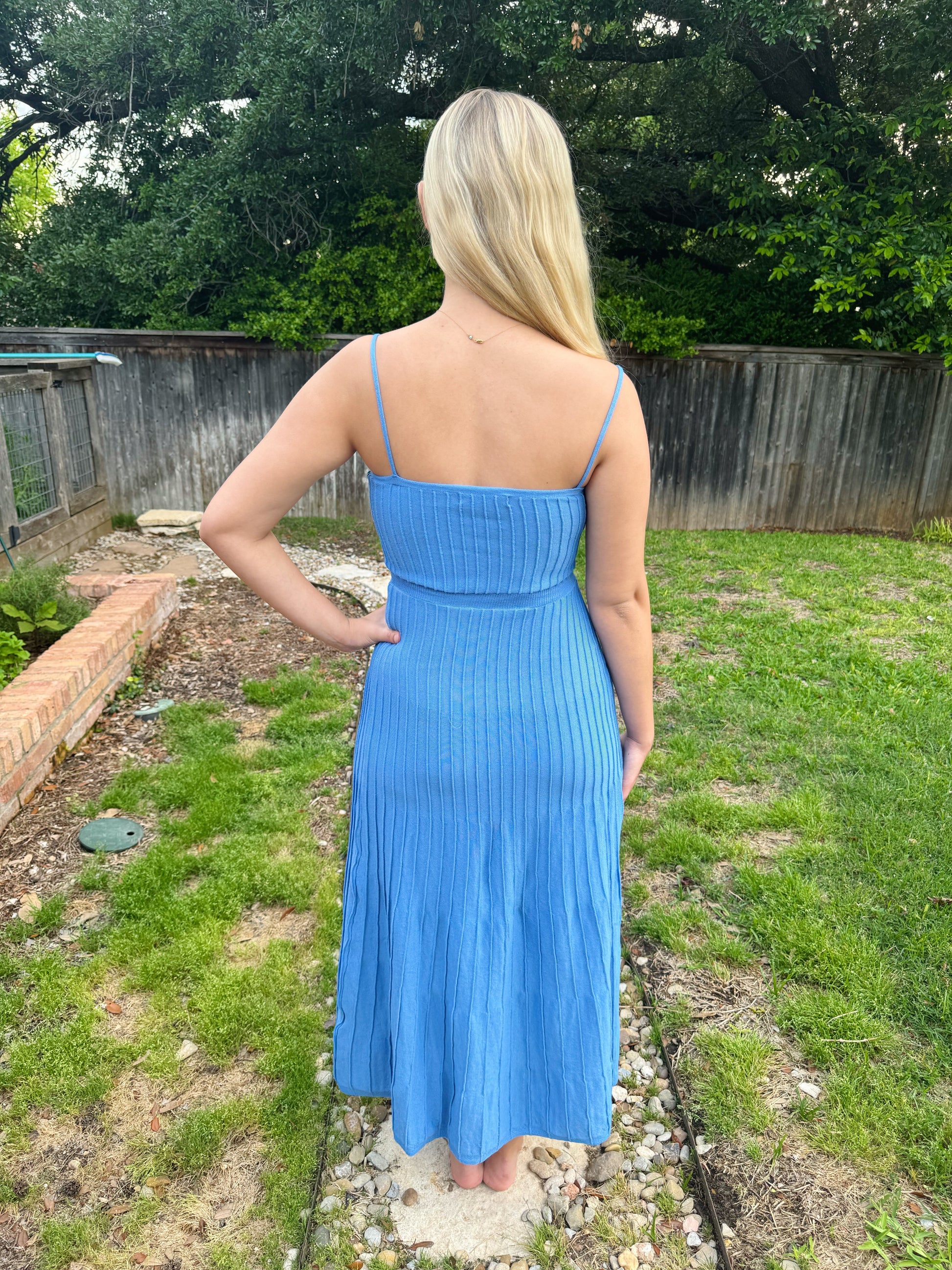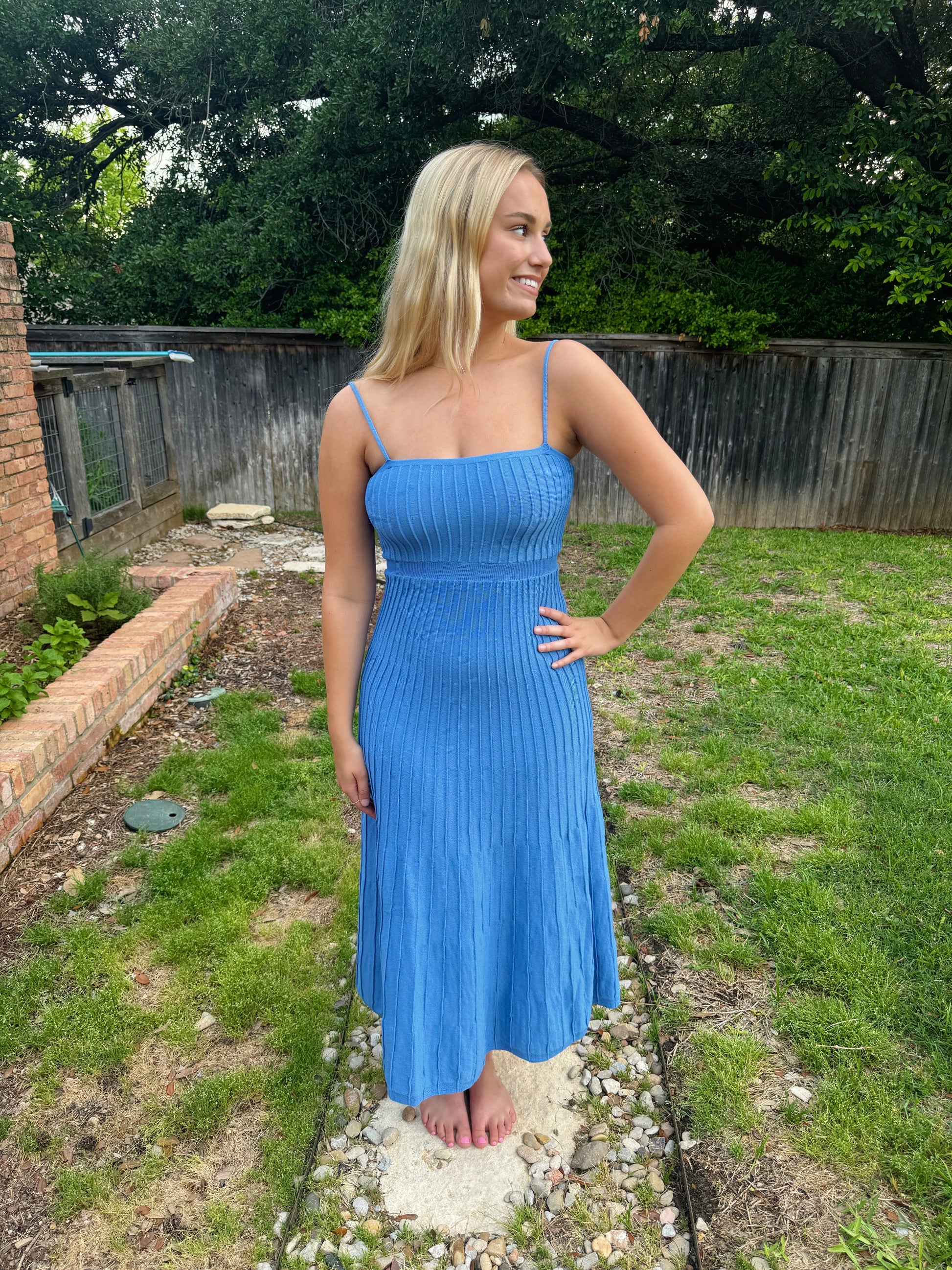 Our Blue Midi Dress is the perfect dress for summer. It has a stretchy knit material and features a sleeveless and a square neck.
