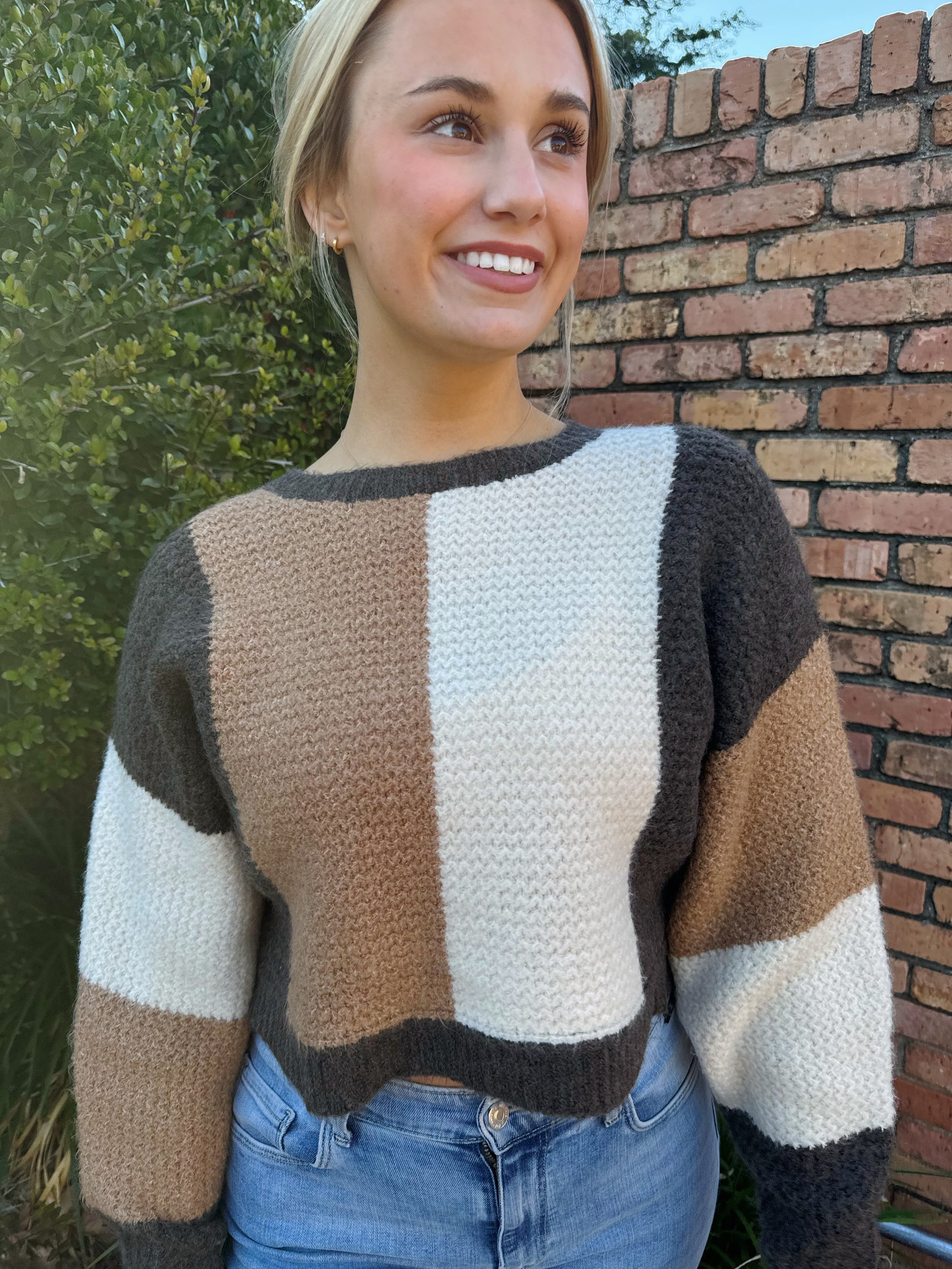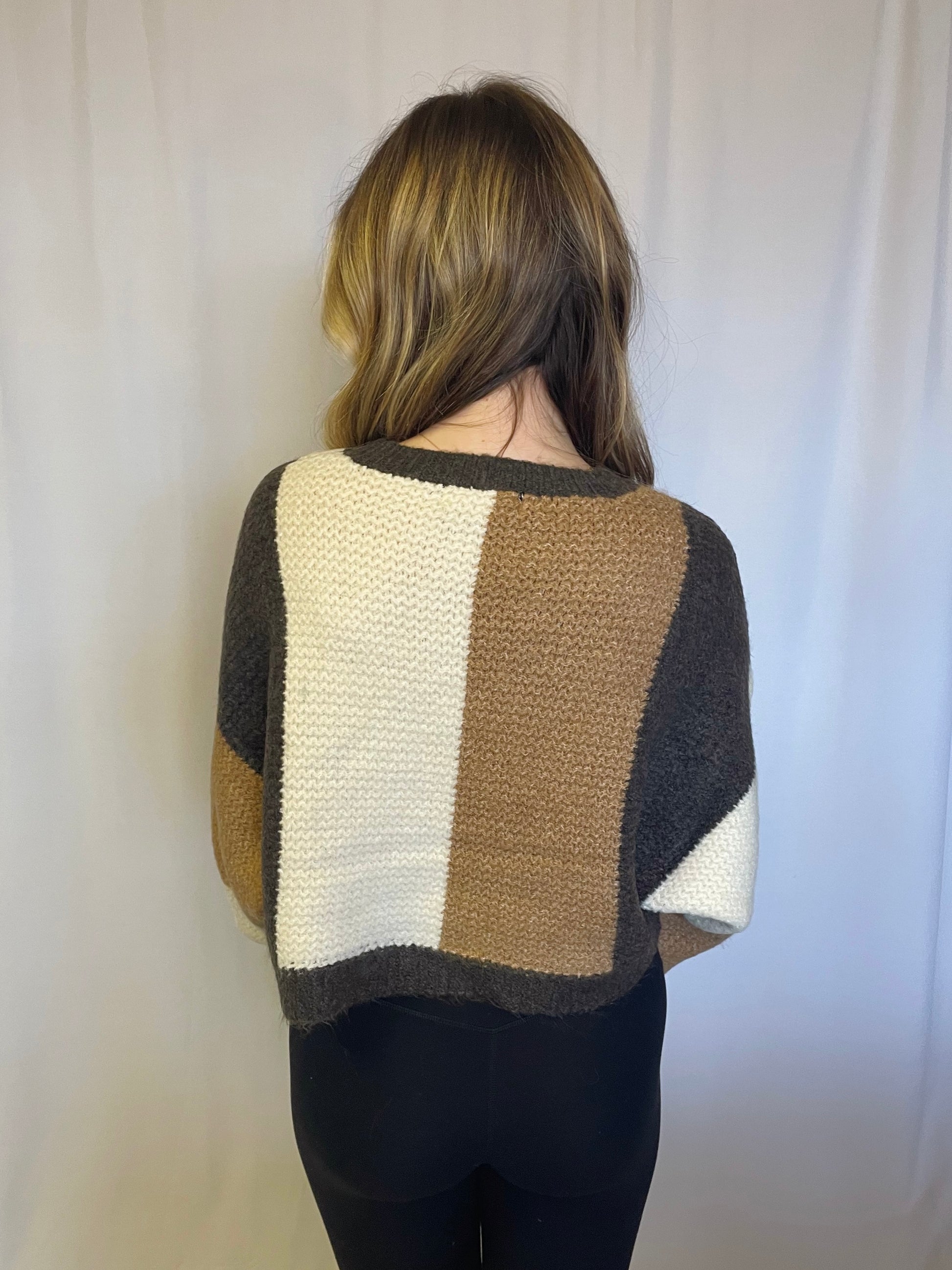This crop sweater is a multi color block crew neck. Super cute with jeans or leggings.