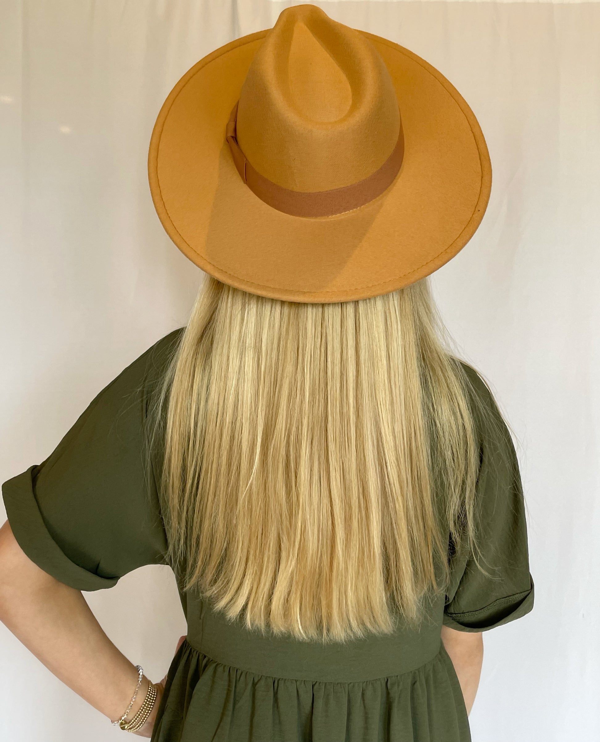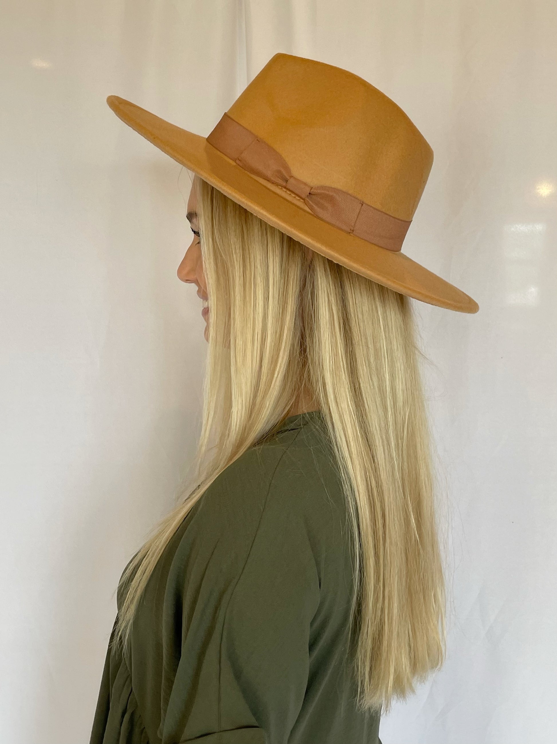 Cute camel felt hat with a bow accent on the brim (wide). One size fits most.