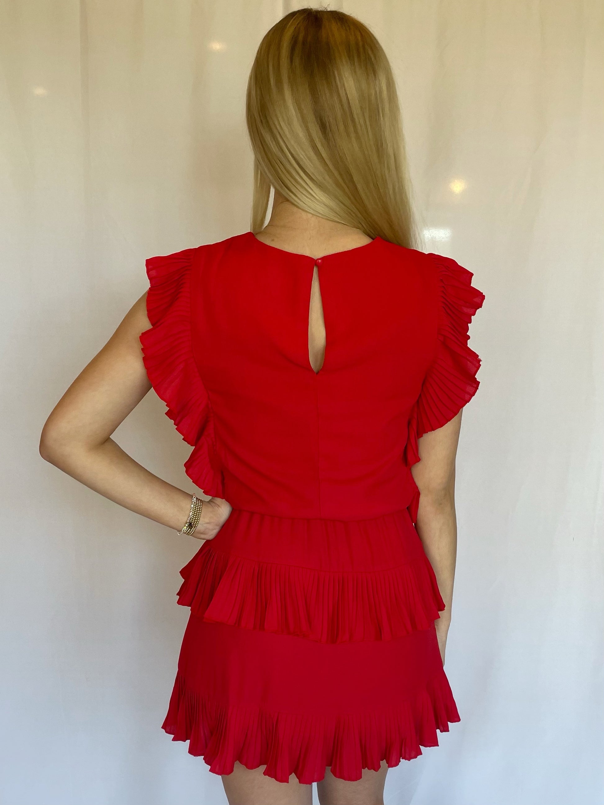 This beautiful red dress is a perfect addition to your closet. Featuring ruffled sleeves, an elastic waistband, a button closure on back and a ruffled skirt.