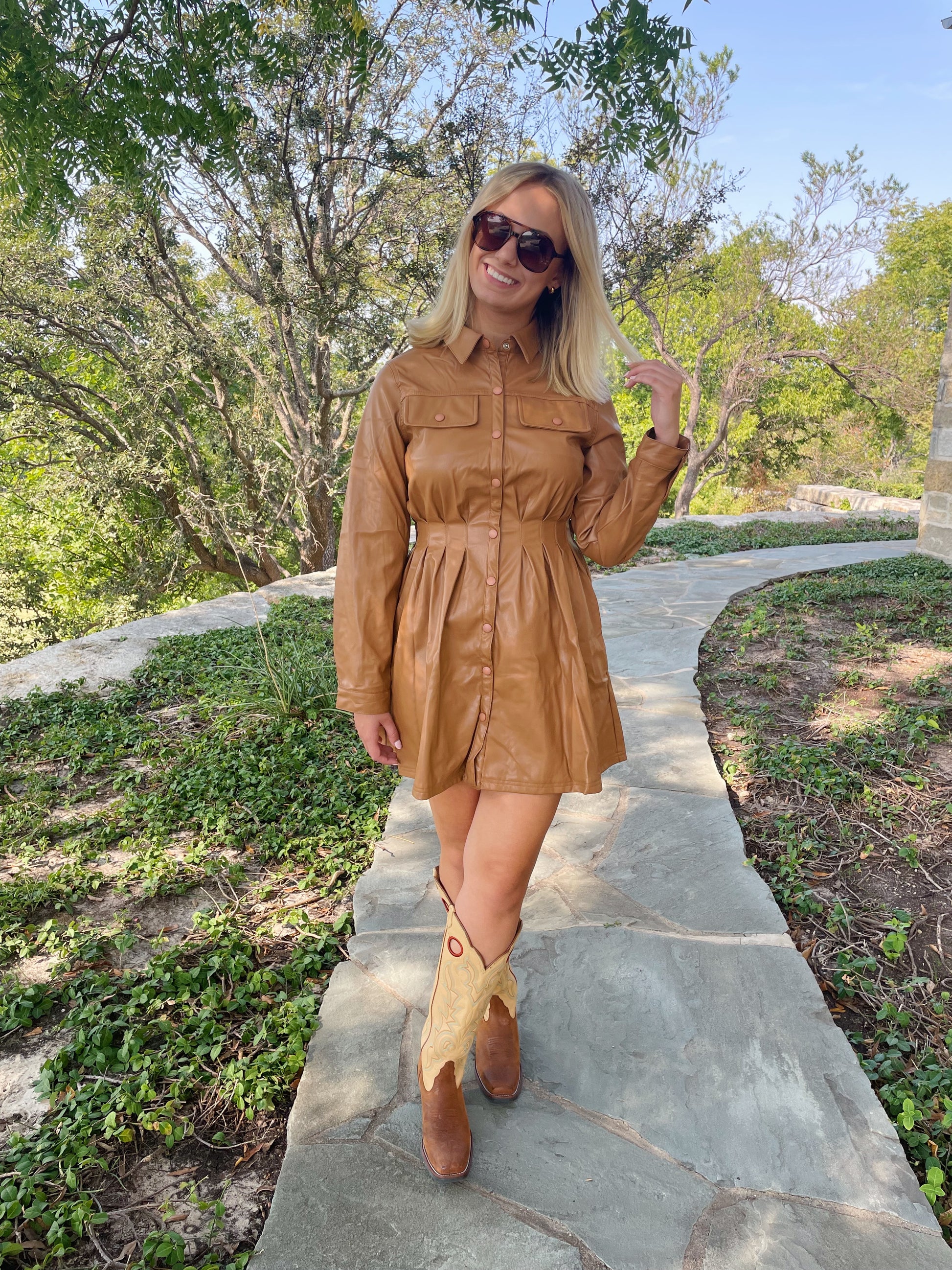 We are obsessed with this leather dress. It is so cute for game days or for the rodeo. It is more comfortable than you would think for leather.