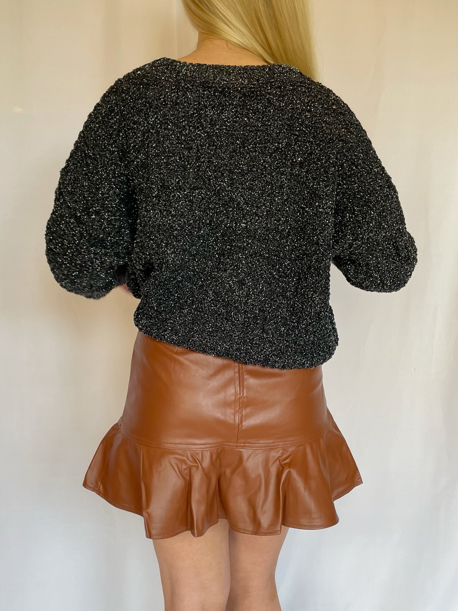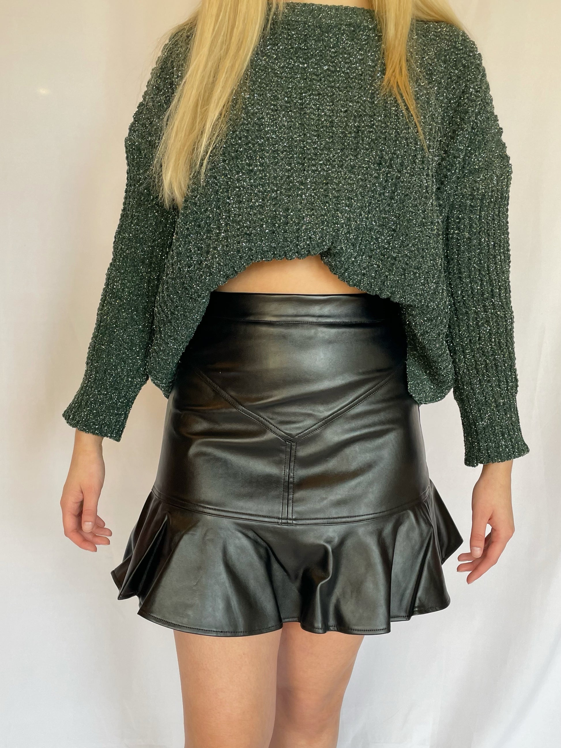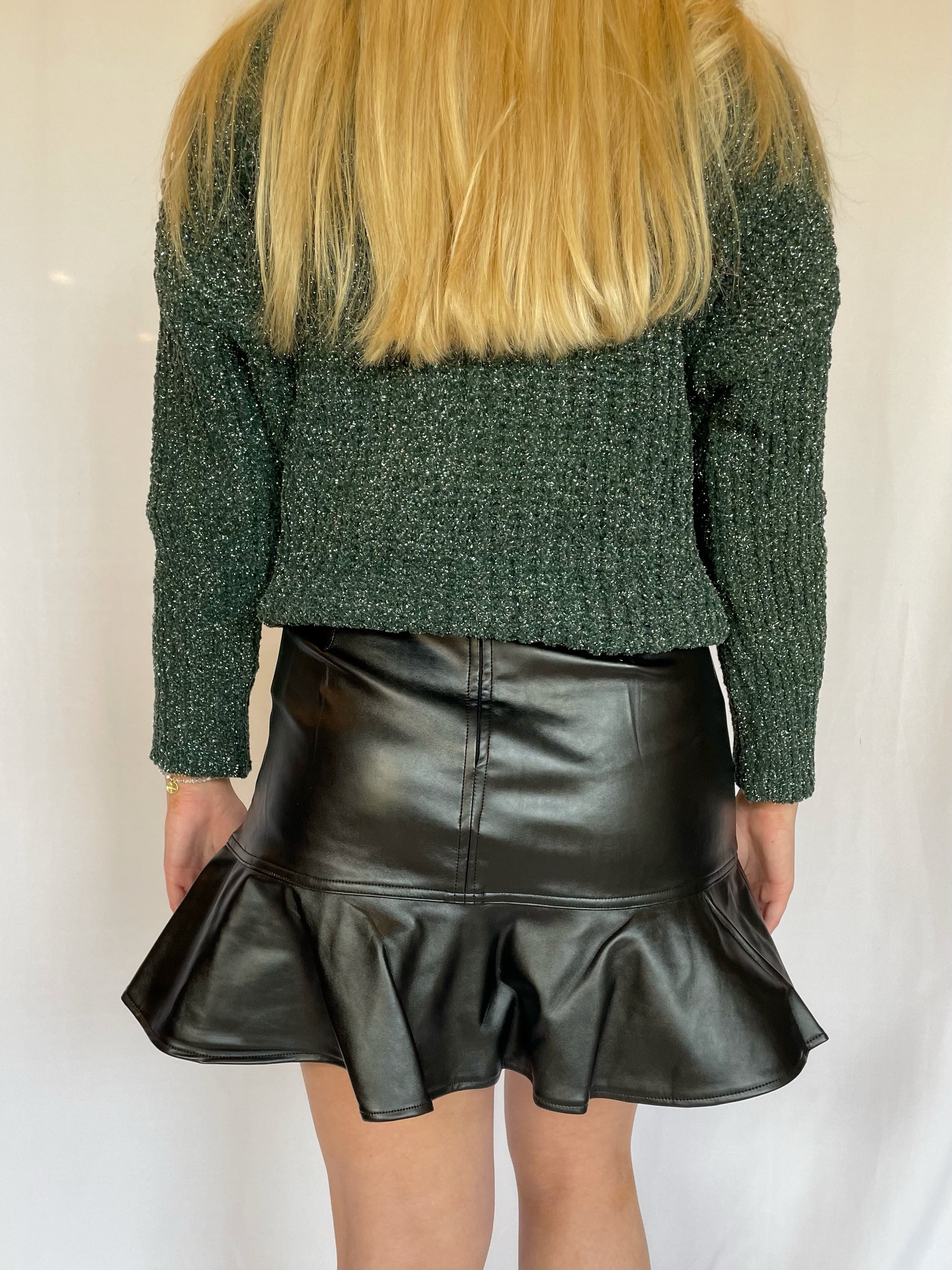 This adorable ruffled leather skirt is a great new addition to your closet. Pairs well with our Sarah Shimmer Sweater or a cute bodysuit.