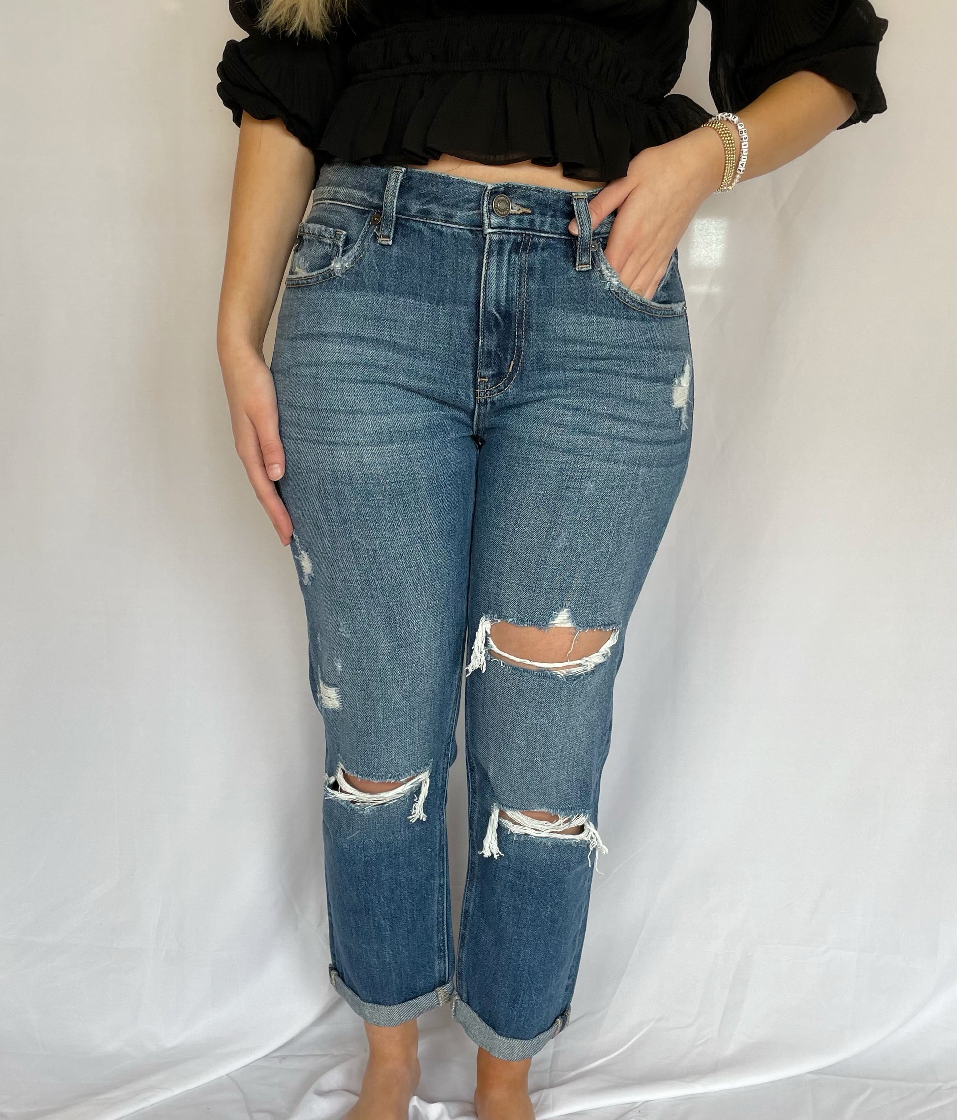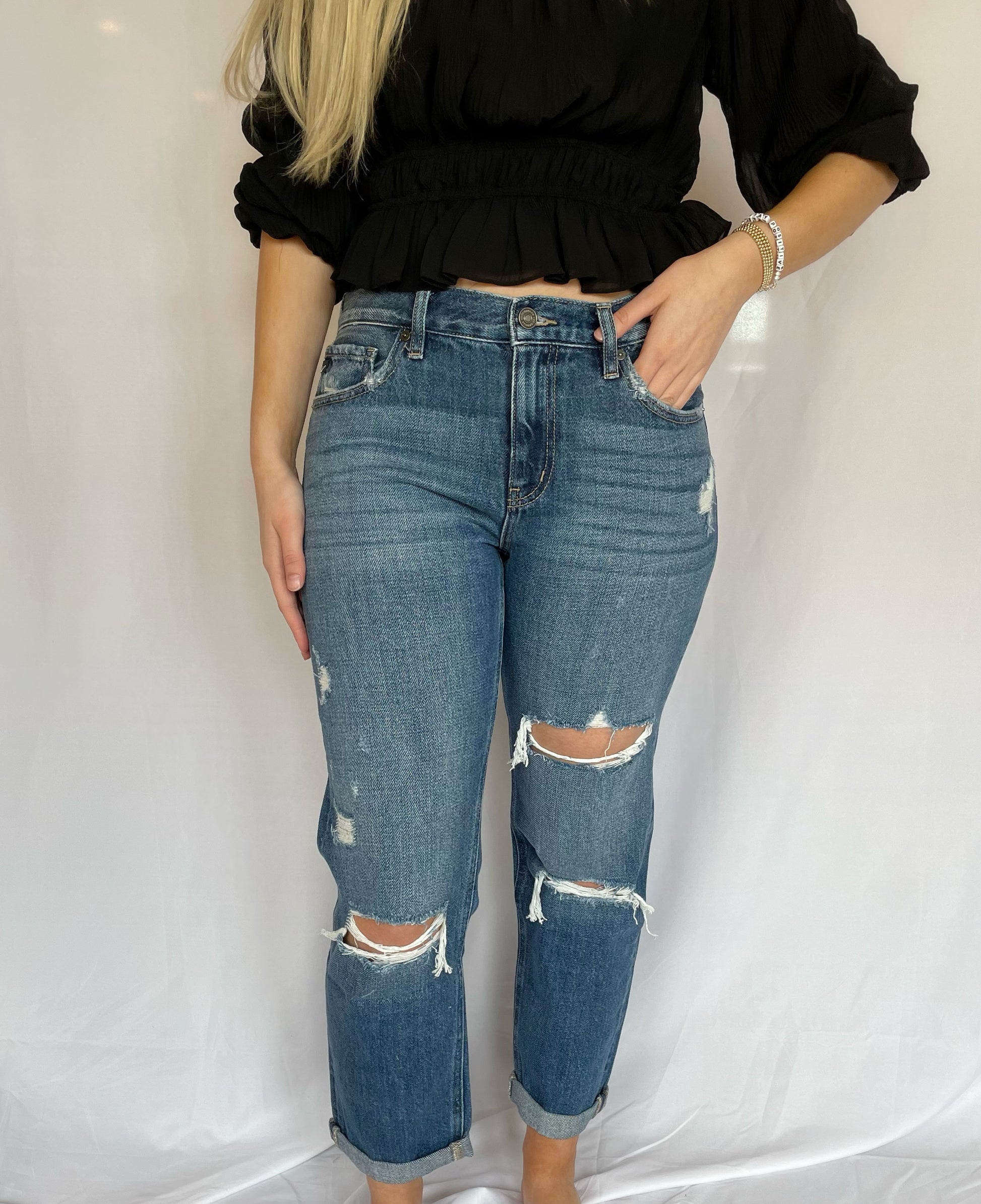 The Michelle jeans are classic mid-rise, distressed boyfriend jeans.