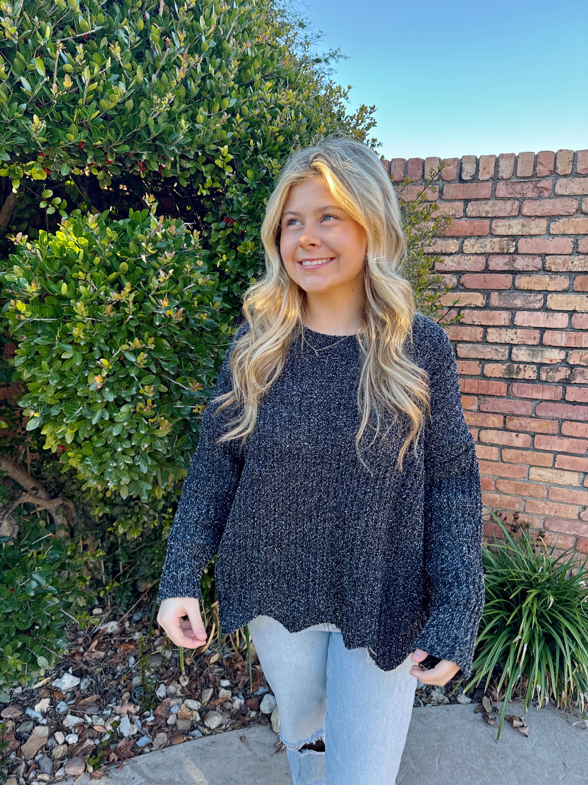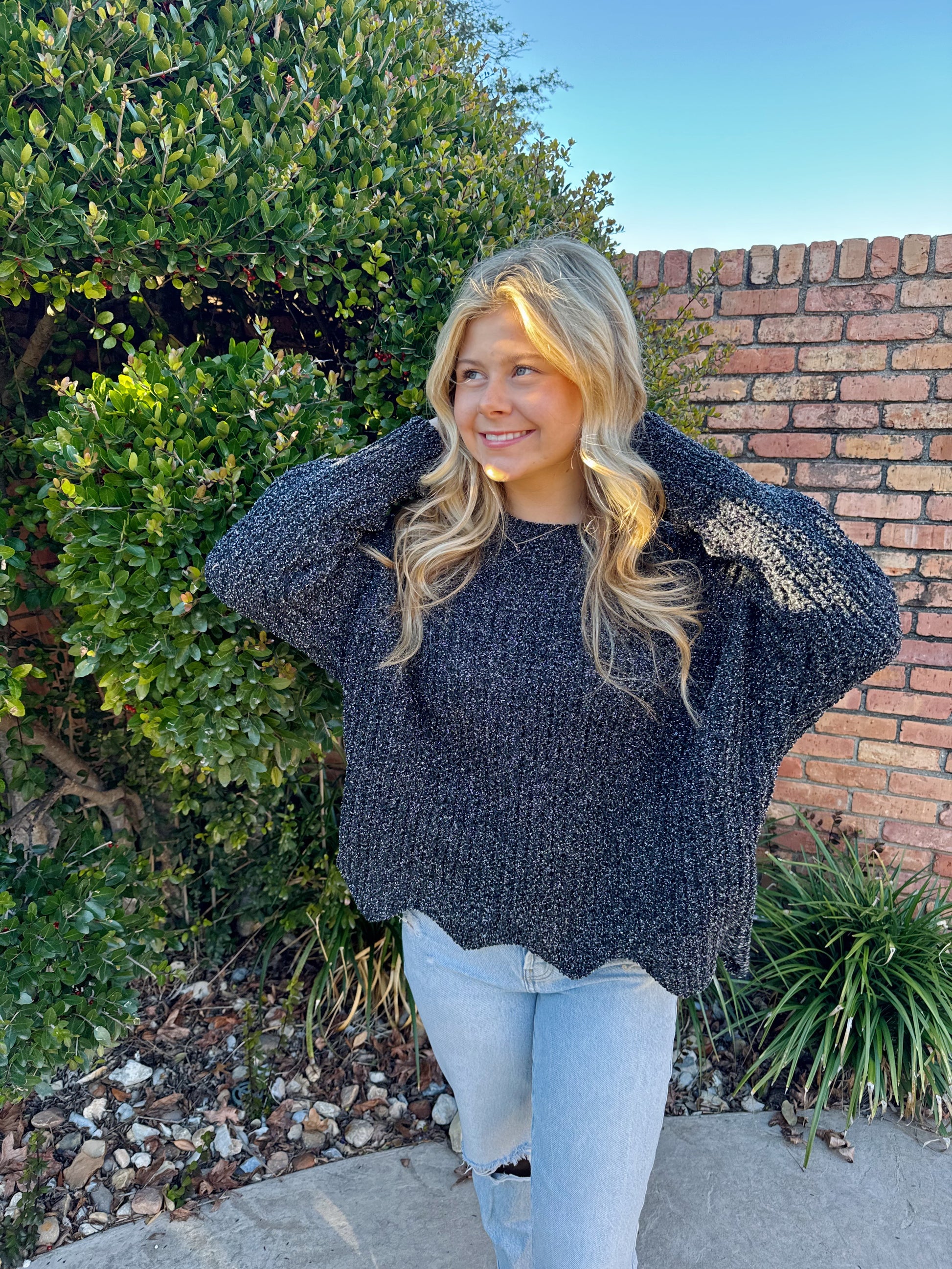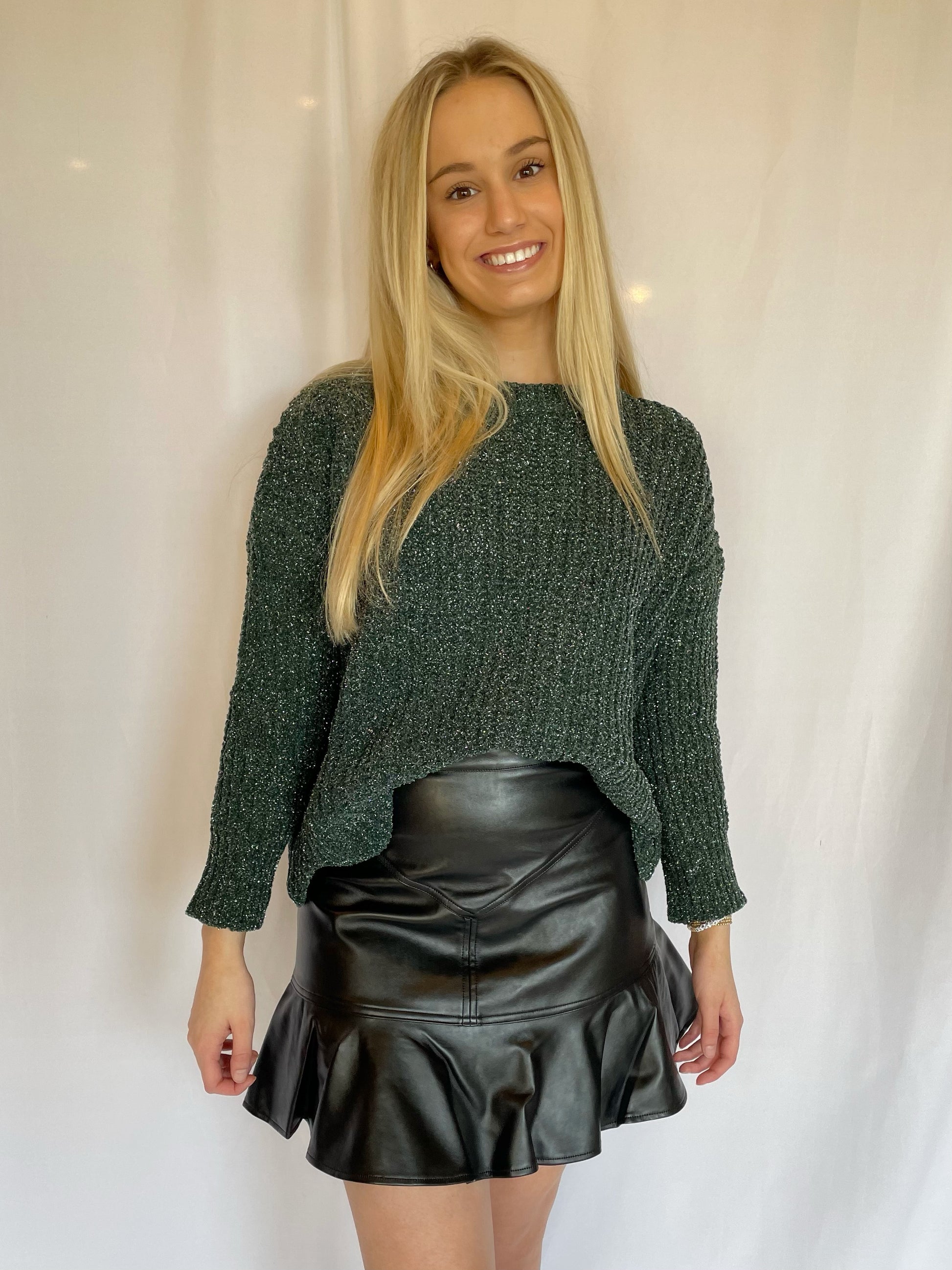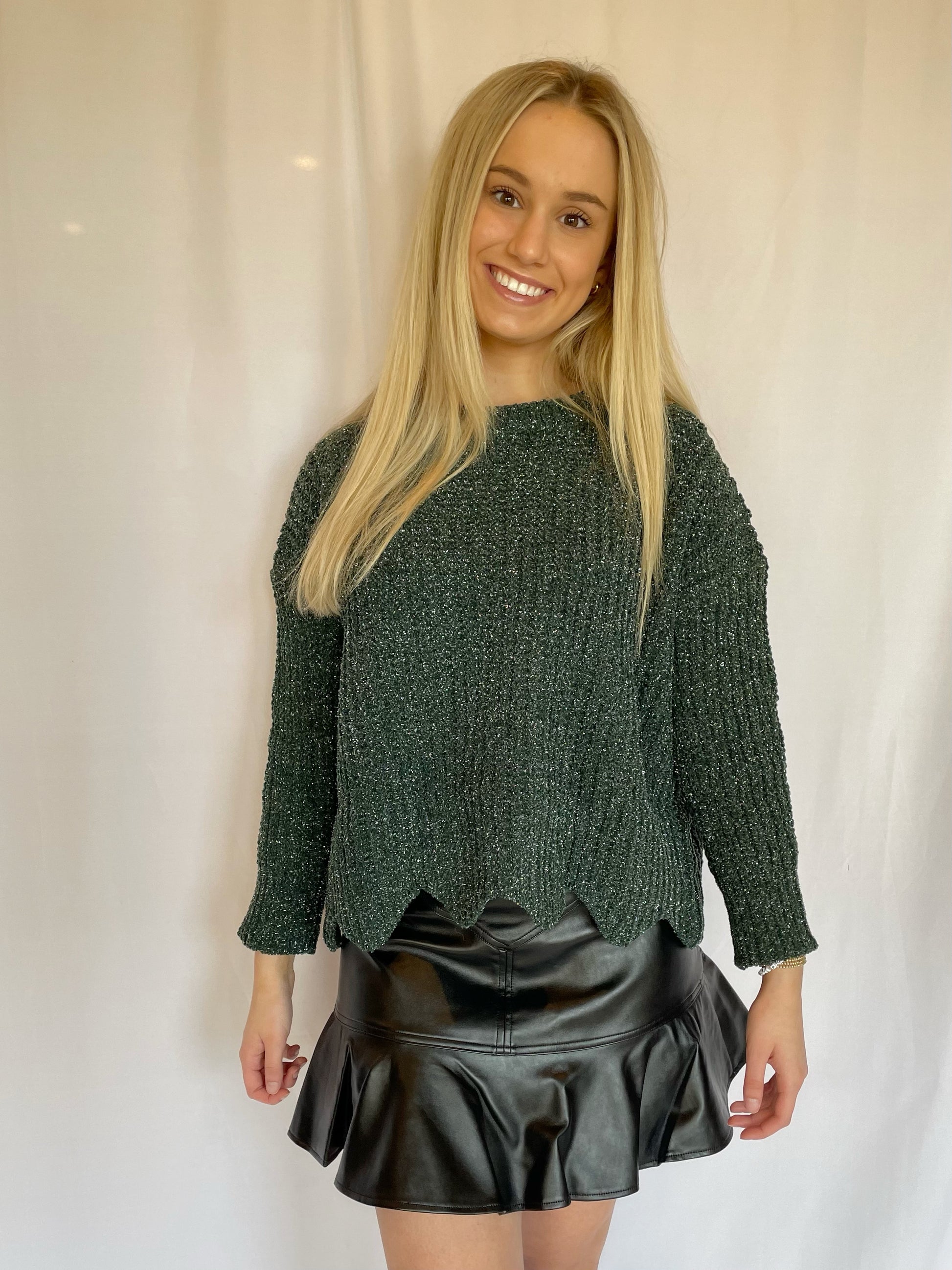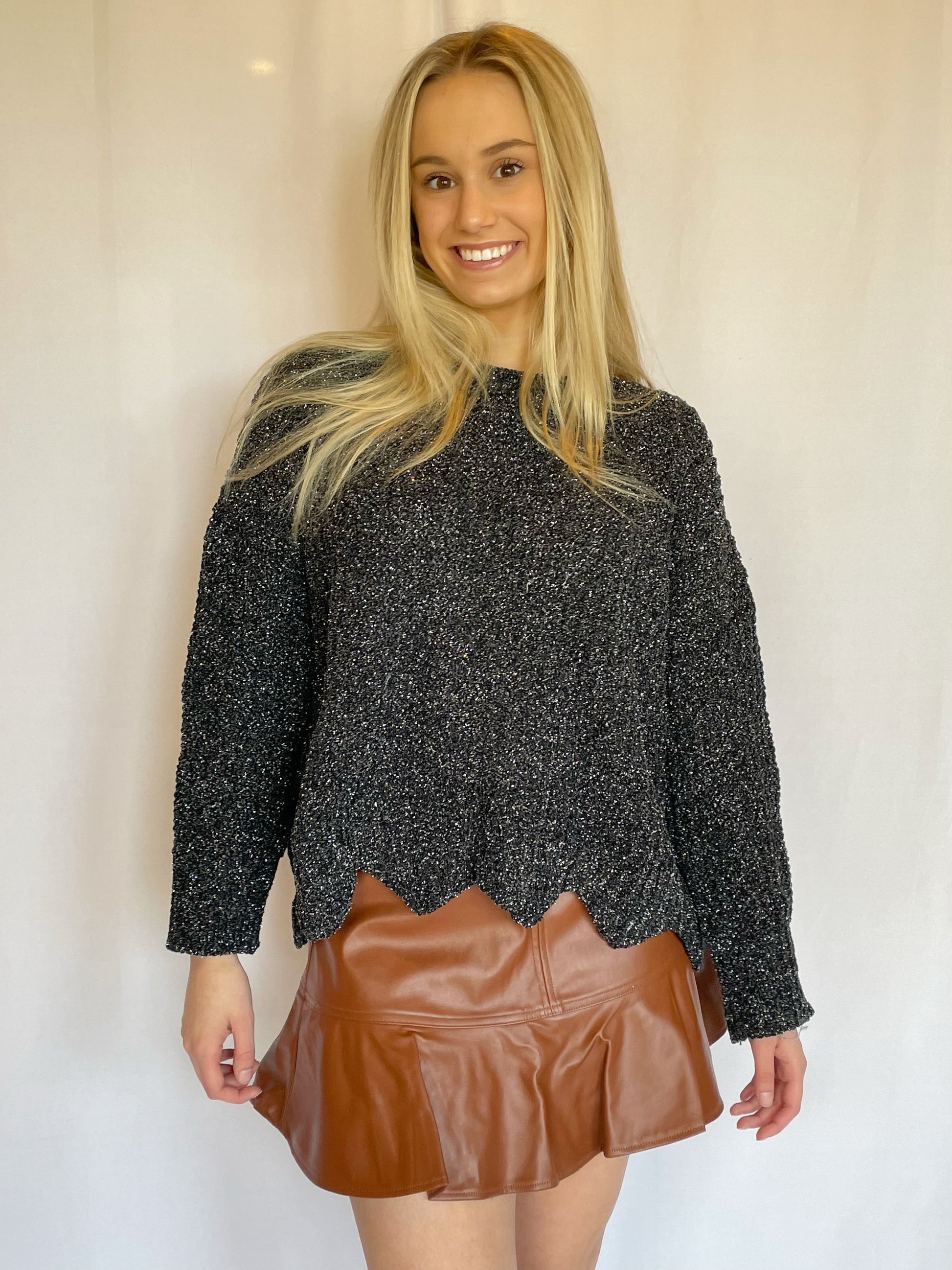 This sweater features a scalloped hem. Matches well with our high-waisted ruffle leather skirt or a cute pair of jeans with some booties.