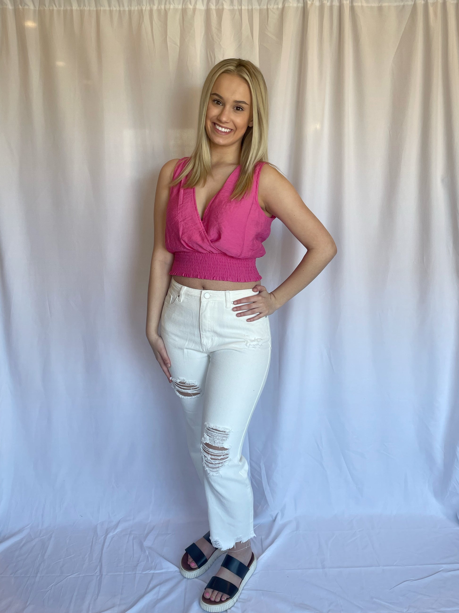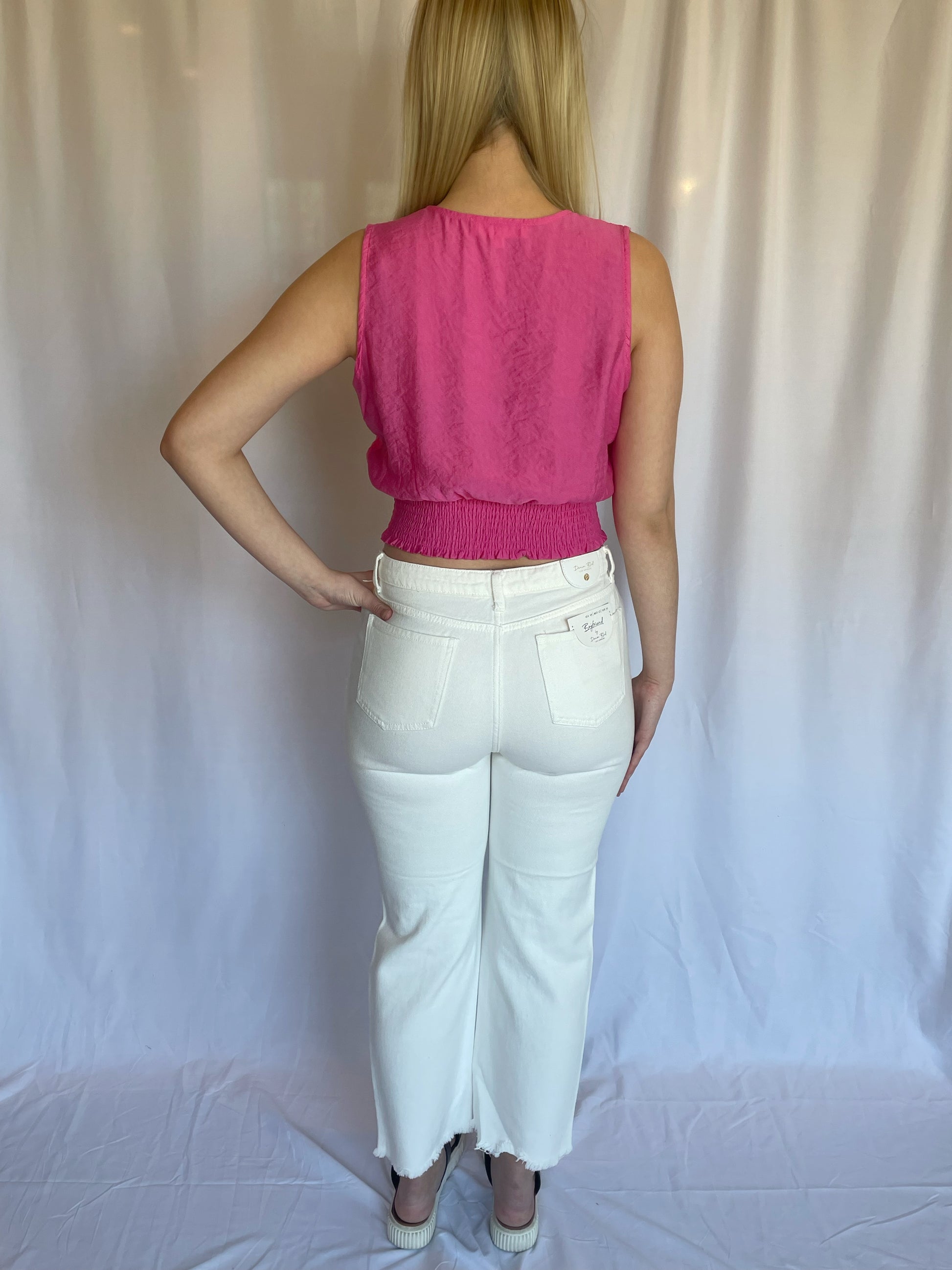 This pink tank features a smocked waist, flared sleeve, and a v-neck cut.