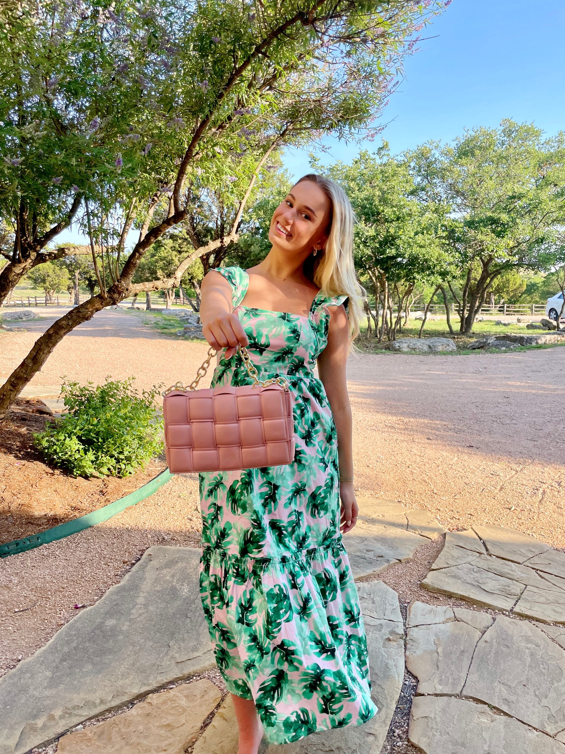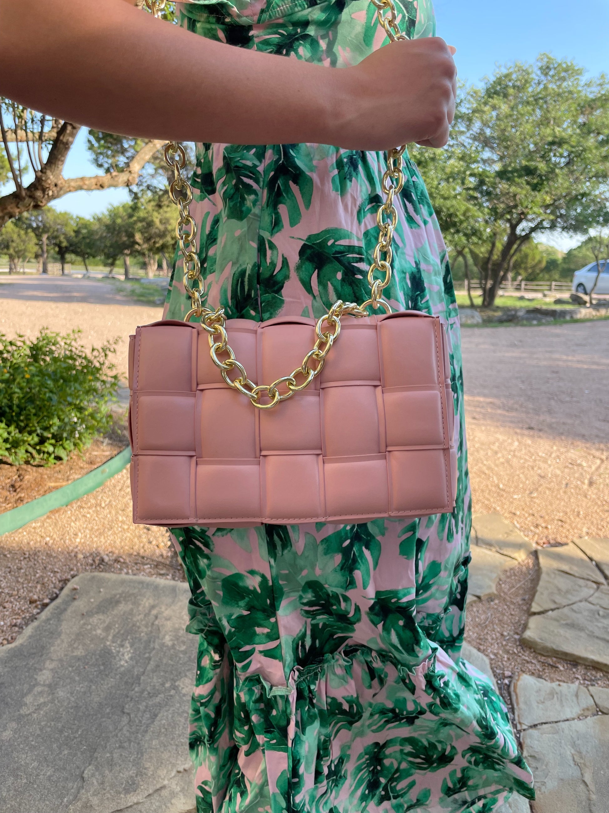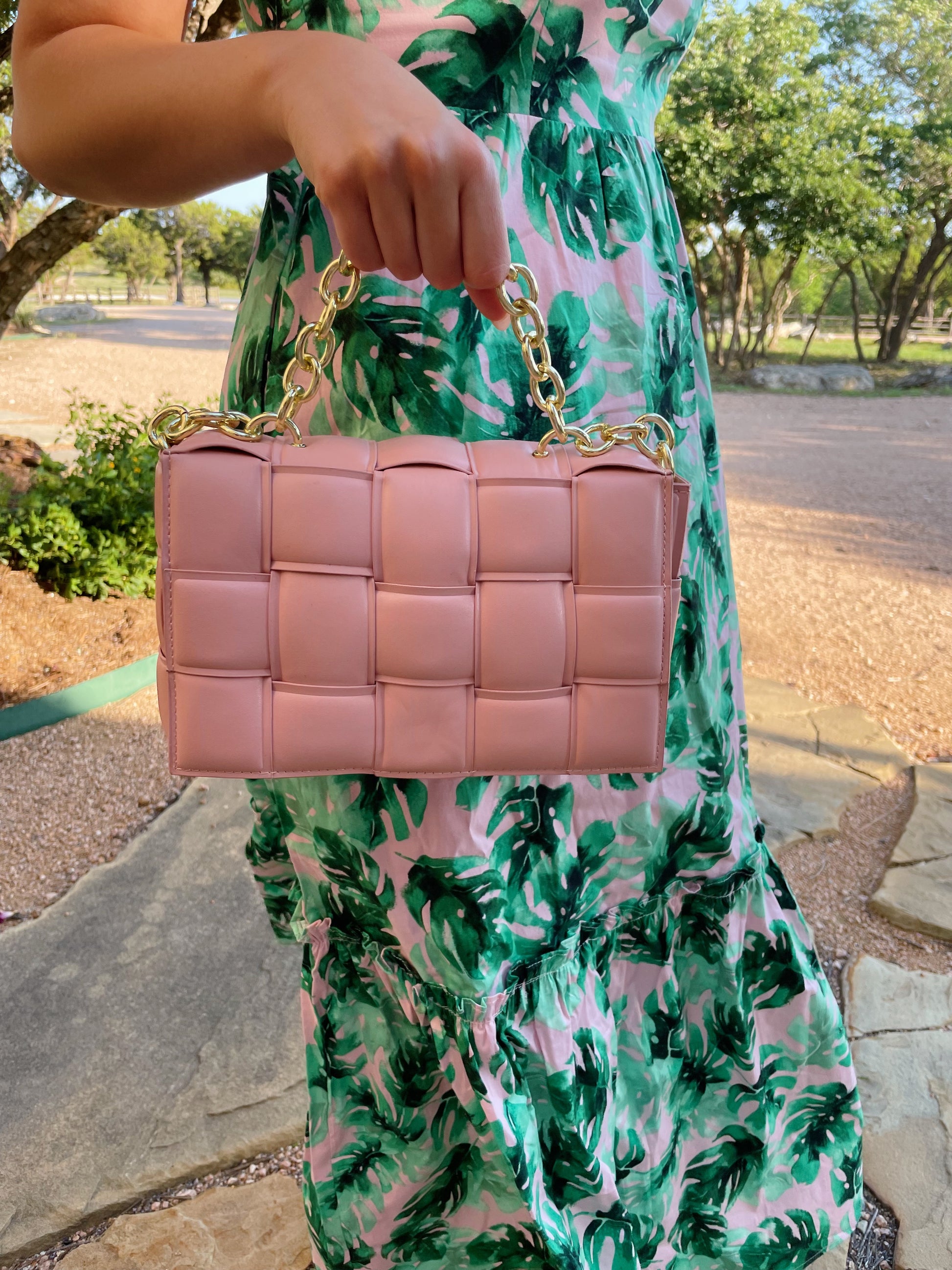 This woven medium sized purse features a chain shoulder strap, magnetic closure and a removable zipper pouch on the inside.