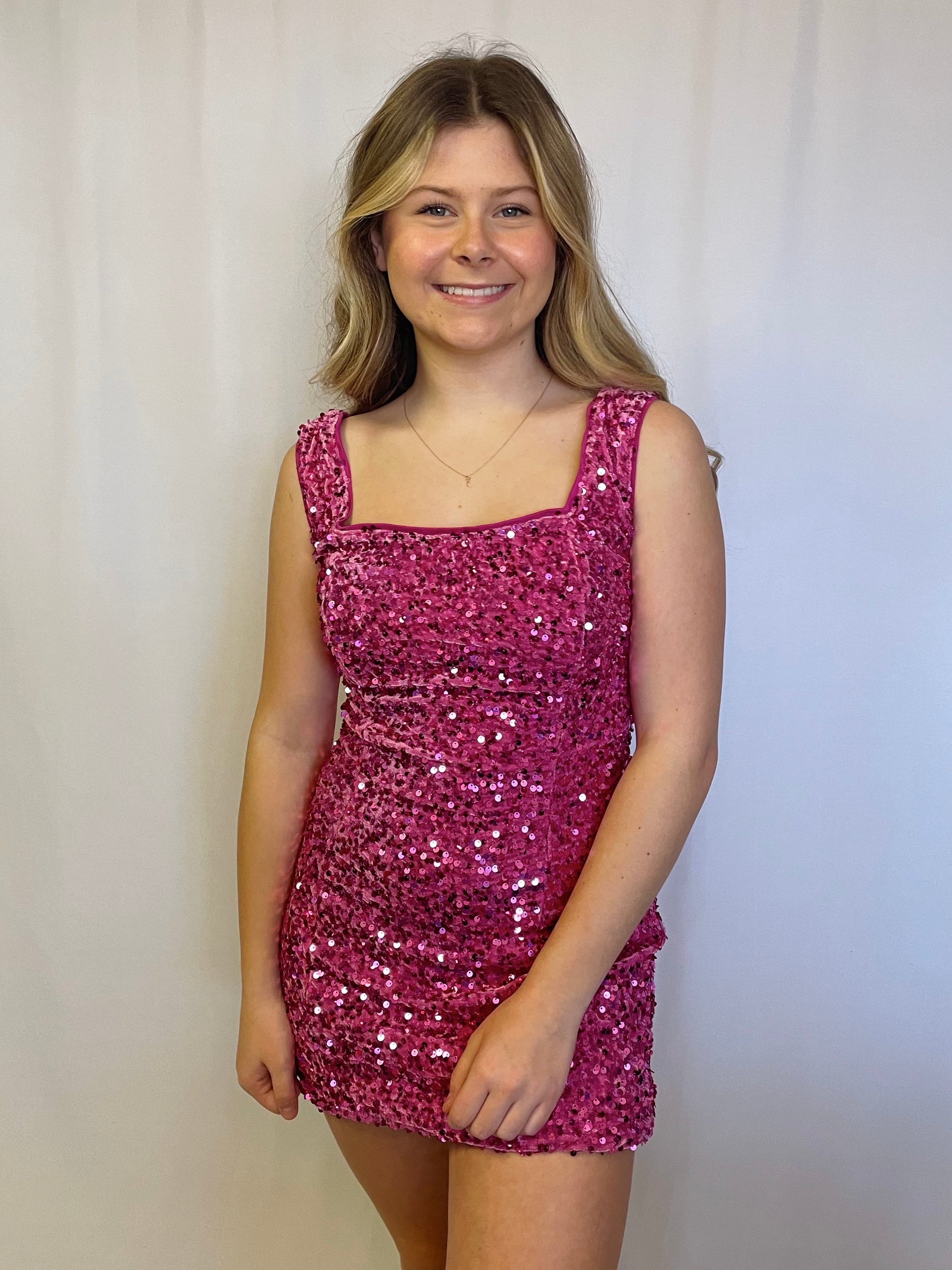 Monochromatic sequined mini dress. front/back square neckline, thick tank sleeves, and bodycon fitted body.