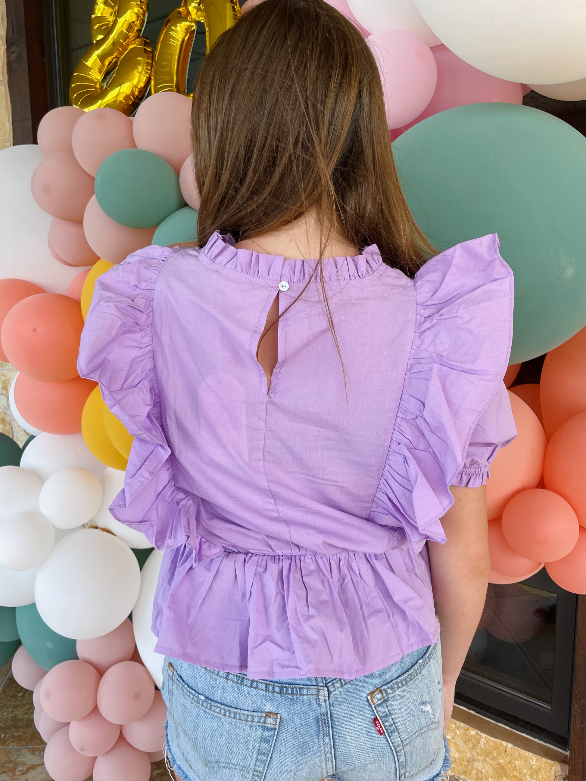 features ruffle shoulders, short bubble sleeves, and a frill mock neckline