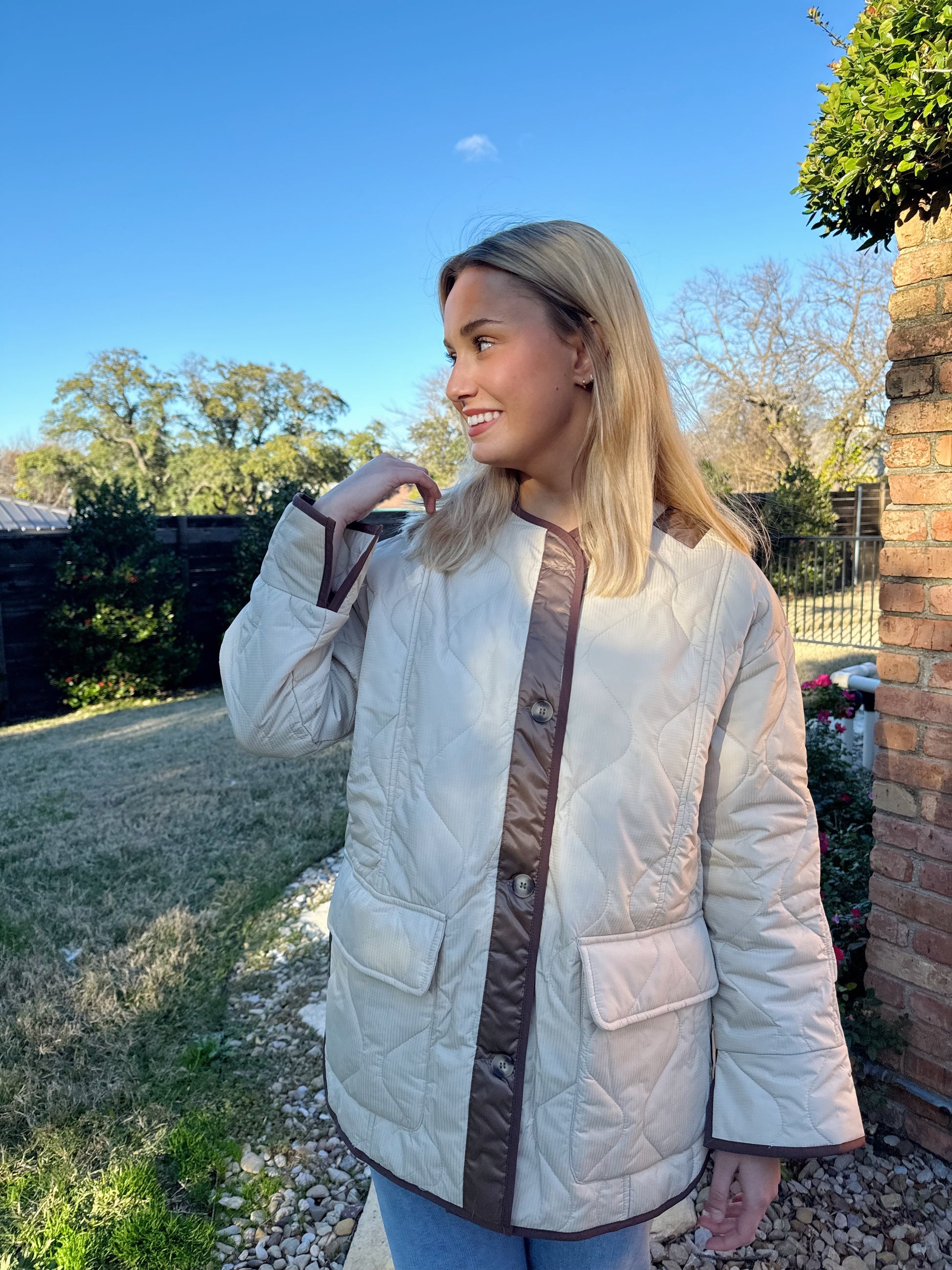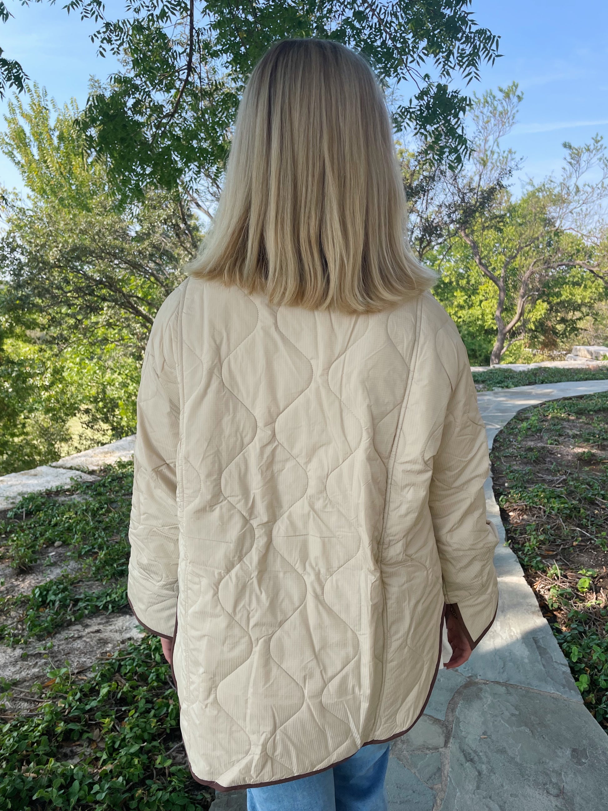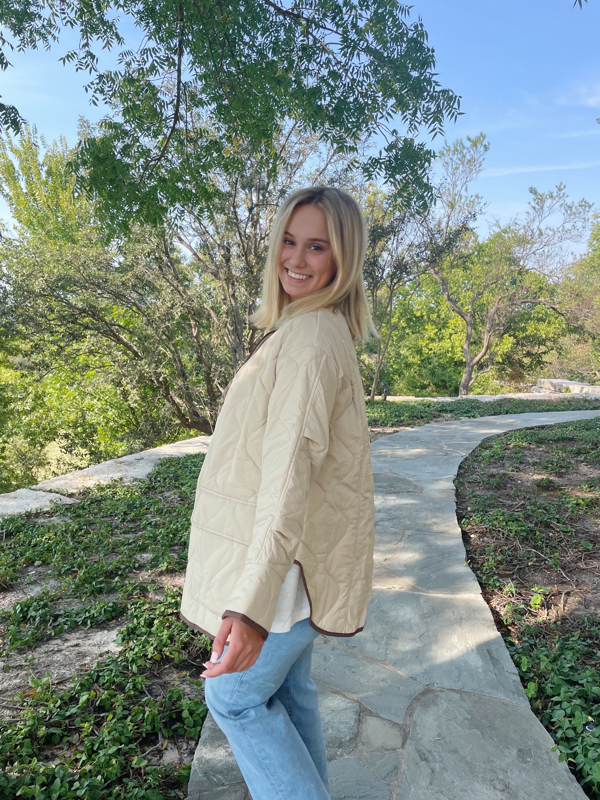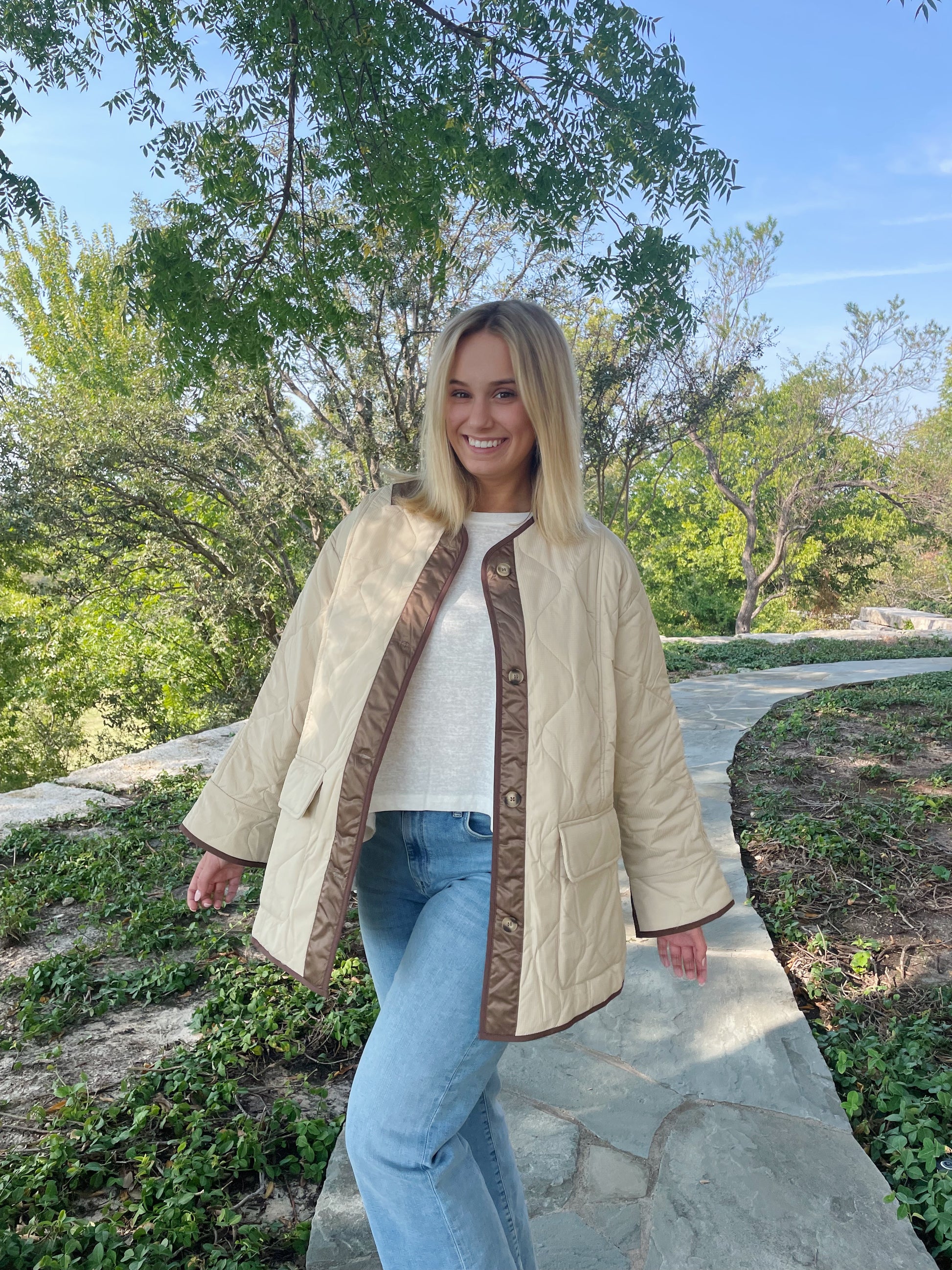 This jacket is lightweight and has 4 buttons going down the front. It pairs well with any of our jeans and our white Macy top.