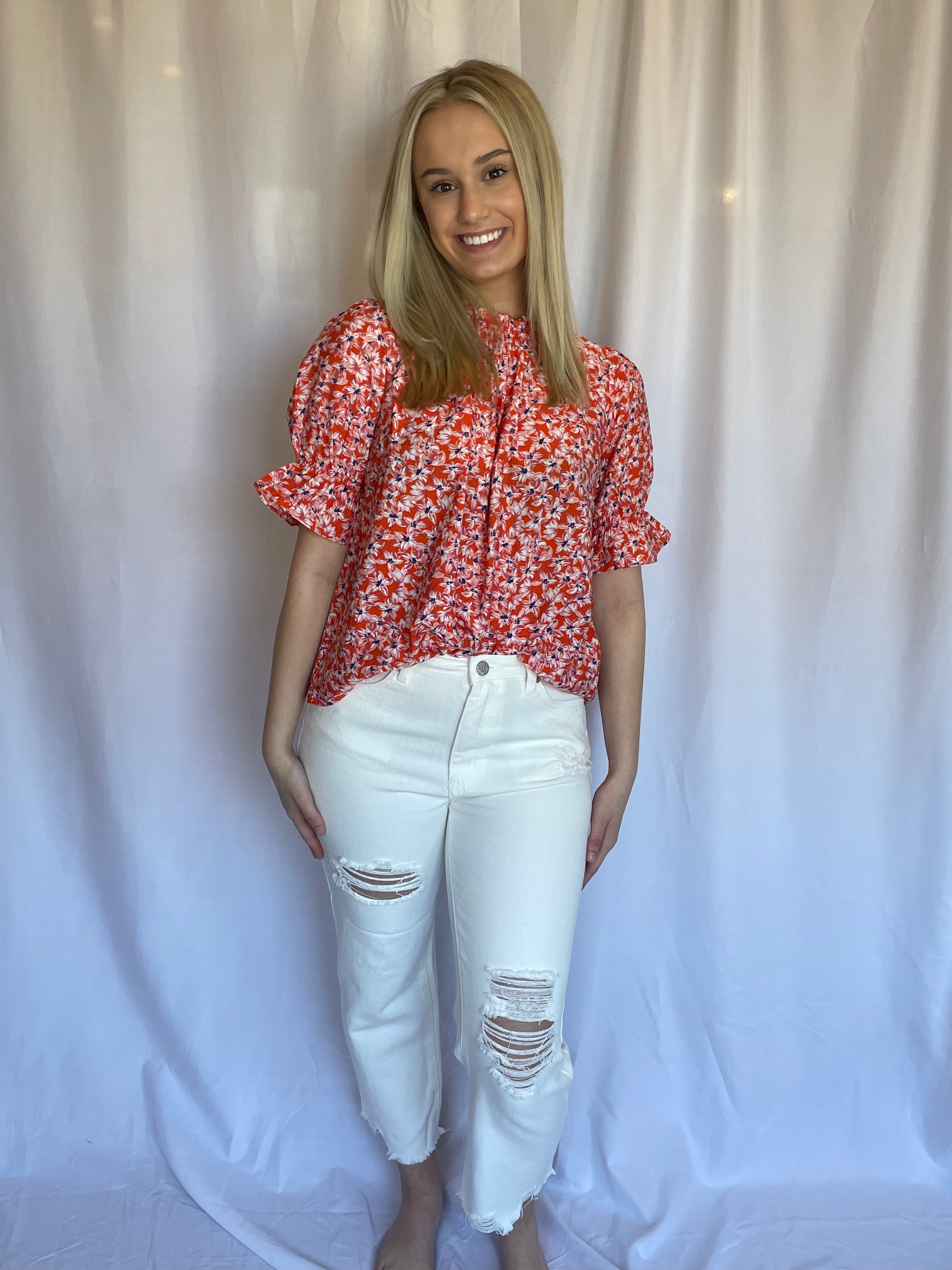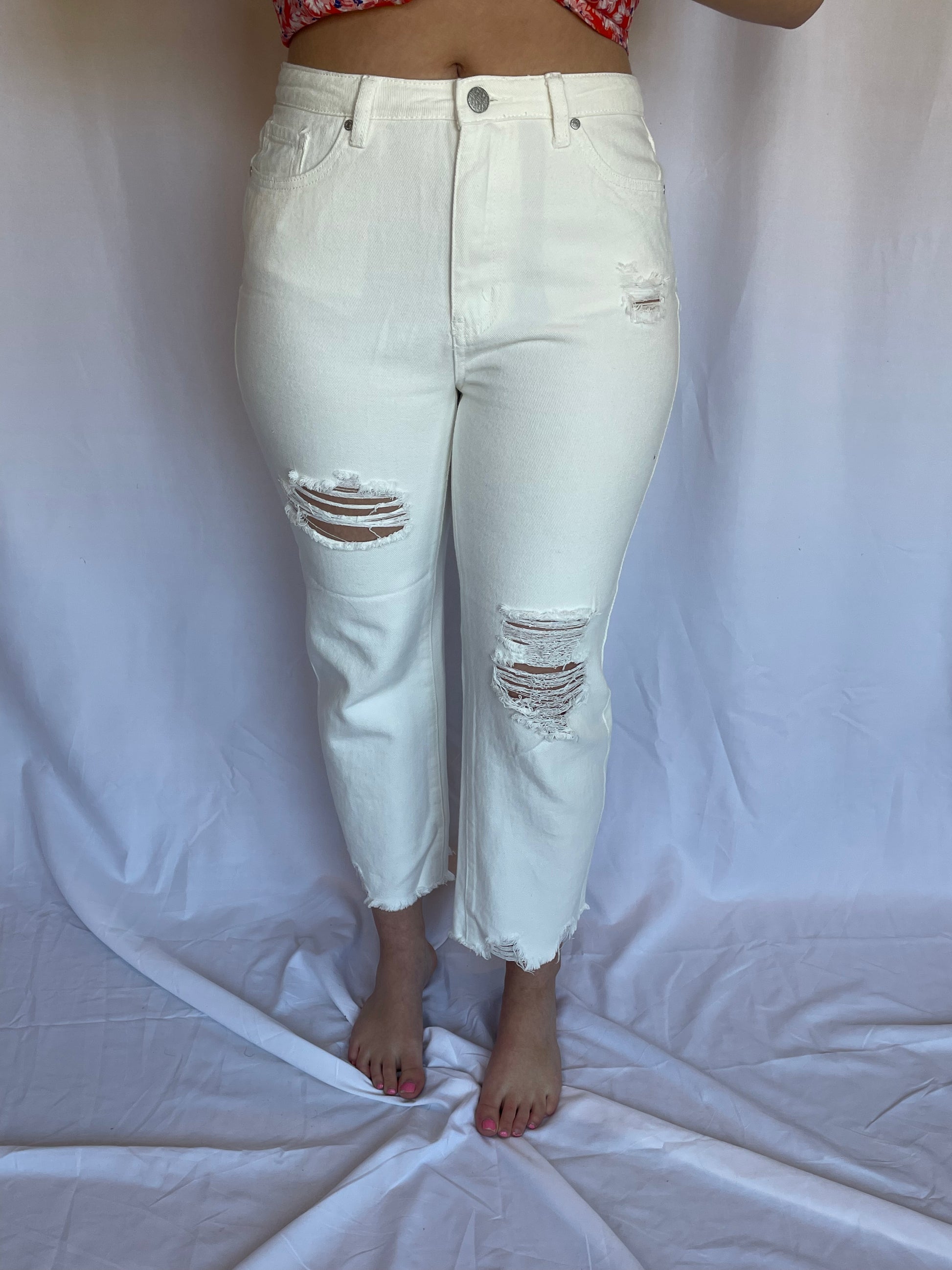 These cute distressed white boyfriend jeans are straight-fit and high-waisted.